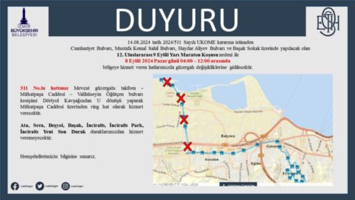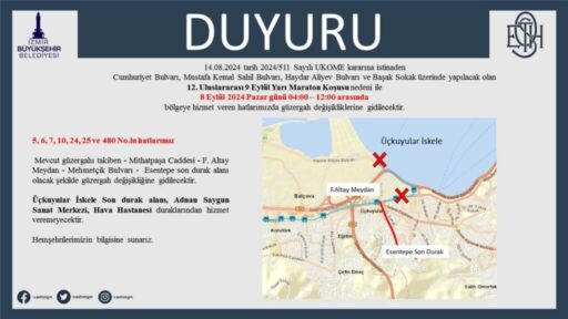 5, 6, 7, 10, 24, 25 ve 480 numaralı hatlar mevcutgüzergahı takiben Mithatpaşa Caddesi – Fahrettin Altay Meydanı – Mehmetçik Bulvarı – Esentepe Son Durak hattında çalışacak. Otobüsler; Üçkuyular İskele Son Durak Alanı, Adnan Saygun Sanat Merkezi ve Hava Hastanesi duraklarına hizmet veremeyecek.