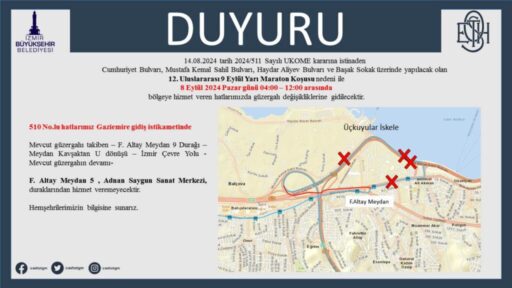 510 numaralı hat Gaziemir’e gidiş istikametinde mevcut güzergâhı takiben Fahrettin Altay Meydanı 9 Durağı – Meydan Kavşaktan U dönüşü – Çevre Yolu – mevcut güzergâhın devamı şeklinde hizmet verecek. Bu hattın otobüsleri, yarı maraton sona erinceye dek Fahrettin Altay Meydan 5 ve AhmedAdnan Saygun Sanat Merkezi duraklarına uğrayamayacak.