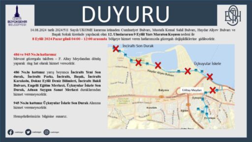 486 ve 945 numaralı hatlar mevcut güzergâhı takiben Fahrettin Altay Meydanı’ndan dönüş yaparak ring hat olarak hizmet verecek. 486 numaralı otobüs, yarış boyunca; İnciraltı Yeni Son durak, İnciraltı Parkı, İnciraltı, Başak, İnciraltı Karakolu, Dokuz Eylül Deniz Bilimleri, İnciraltı Bakü Bulvarı, Engelli Eğitim Merkezi, Üçkuyular İskele Son Durak ve Adnan Saygun Sanat Merkezi duraklarına hizmet veremeyecek. 945 numaralı otobüs ise Üçkuyular İskele Son Durak alanına giremeyecek.