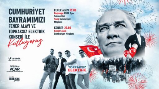 Resmi programın ardından kutlamalar akşam Aliağa Belediyesi öncülüğünde organize edilecek Fener Alayı ve korteji ile devam edecek. Saat 19.00’da Aliağa Belediyesi Spor Salonu önünden başlayacak fener alayında Aliağalılar, bando ve marşlar eşliğinde, Cumhuriyet Meydanı’na yürüyecek. Cumhuriyet Bayramı kutlamaları Cumhuriyet Meydanı’nda saat 20.00’de Aliağalı gençlerden oluşan ‘Topraksız Elektrik’ grubunun konseriyle son bulacak.