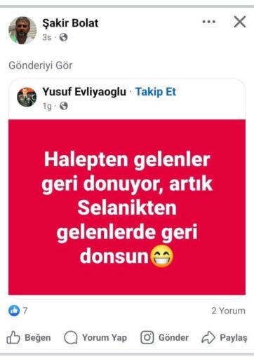Niksar Halk Eğitim Merkezi Müdürü Şakir Bolat tarafından paylaşılan Yusuf Evliyaoğlu’na ait gönderi ‘Halep’ten gelenler geri dönüyor. Artık Selanik’ten gelenler de geri dönsün’ şeklinde bir paylaşım Tokat’ta tepkilere neden oldu. Tokat MEB soruşturma başlatıldığını duyurdu. Konya’da Atatürk Ortaokulu Müdürü Mehmet Binbir, sosyal medya hesabından “Halep’ten gelenler geri dönüyor. Artık Selanik’ten gelenler de geri dönsün” şeklinde paylaşımda bulundu. Paylaşımın ardından Binbir, hakkında soruşturma başlatıldığı açıklanıyor.