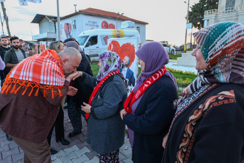 Menemen Belediye Başkanı Aydın Pehlivan kırsal mahalle ziyaretleri sırasında vatandaşların sevgi