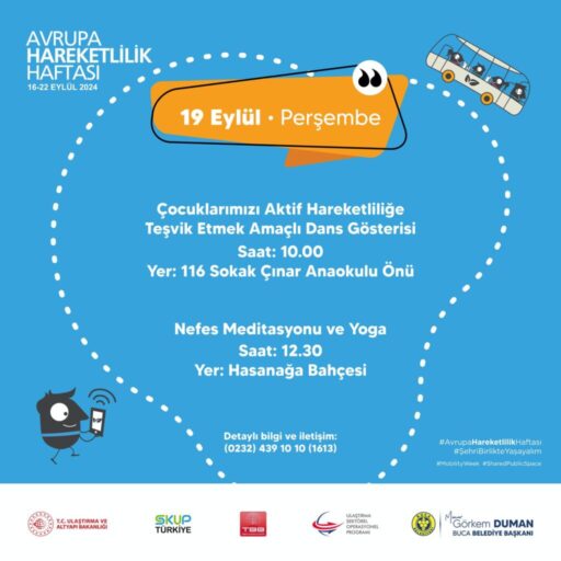 Buca Belediyesi bu yıl “Paylaşımlı Kamusal Alanlarda Şehri Birlikte Yaşatalım” temasıyla gerçekleşecek olan Avrupa Hareketlilik Haftası çerçevesinde pek çok etkinliğe ev sahipliği yapacak. Hafta kapsamında karbon emisyonunu azaltarak çevreci ulaşım tedbirlerine dikkat çekmek için Açık Sokaklar ve Otomobilsiz Kent günleri düzenlenecek. Program kapsamında 19 Eylül Perşembe günü çocukları aktif hareketliliğe özendirmek üzere Vali Rahmi Bey Mahallesi’ndeki Çınar Anaokulu önünde saat 10.00’da sokak oyunları ve dans gösterisi gerçekleştirilecek. Aynı gün, saat 12.30’da Hasanağa Bahçesi’nde ise Bucalıların katılımı ile nefes meditasyonu ve yoga yapılacak.