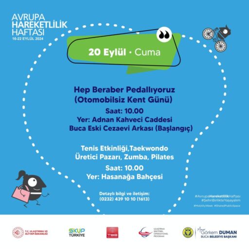 Dopdolu bir programla geçecek hafta kapsamında Buca Belediye Başkanı Görkem Duman, 20 Eylül Cuma günü kentsel hareketliliği teşvik etmek amacıyla Adnan Kahveci Caddesi’nden Hasanağa Bahçesi’ne kadar pedal çevirecek.