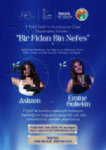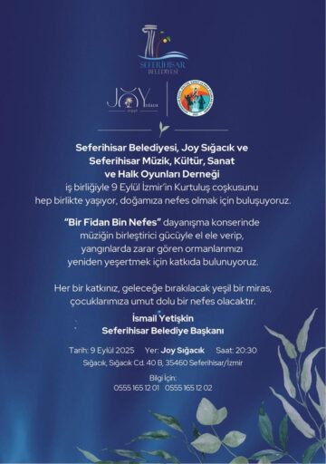 Seferihisar Belediyesi, orman yangınlarında zarar gören alanları yeniden yeşertmek amacıyla Joy Sığacık ve Seferihisar Müzik, Kültür, Sanat ve Halk Oyunları Derneği iş birliğiyle anlamlı bir dayanışma konseri düzenliyor. “Bir Fidan Bin Nefes” adını taşıyan bu özel etkinlikte, Seferihisarlılar hem 9 Eylül’ün kurtuluş coşkusunu yaşayacak hem de doğaya nefes olmanın gururunu hissedecek.