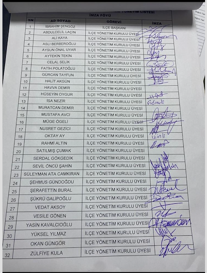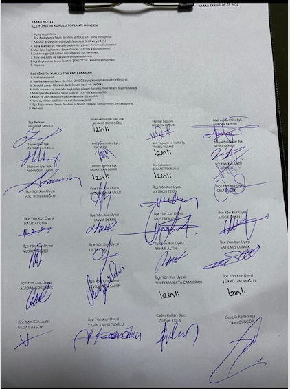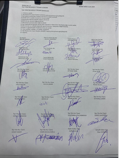 Ayrıca AK PARTİ BUCA ilçe başkanlığı karar defterinin kayıp olması sebebiyle 23.12.2023 tarihli mahkeme kararı ile karar defteri İlçe yönetim kurulu üyesi Mustafa ATEŞ tarafından ilçe seçim müdürlüğünden teslim alınmıştır. Bu nedenle 23.12.2023 tarihinden önce karar alınamaz,alındı ise de alınan kararlar hükümsüzdür.Mevzuata göre karar defteri olmayan hiçbir kurum karar alamaz, yürürlüğe koyamaz. Yönetim kurulu üyeleri hiçbir zaman ilgili şahıslar hakkında istifa kararı almamışlardır.Bu nedenle karar defterinin tüm sayfalarının incelenmesini, şayet böyle bir karar alındığını iddia edenler var ise haklarında SAVCILIK makamına suç duyurusunda bulunacağımı bildiriyorum.