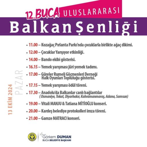 Buca Belediyesi, 12 – 13 Ekim tarihlerinde Hasanağa Bahçesi’nde 12. Buca Uluslararası Balkan Şenliği’ni düzenleyecek. Bu yıl yine dopdolu bir programla geçecek şenliğe tüm İzmirlileri beklediklerini belirten Buca Belediye Başkanı Görkem Duman, “Balkan kültürünün Anadolu coğrafyası ile kucaklaştığı güzel ilçemizde, barışın, kardeşliğin, birlikteliğin şenliğini yaşamaya hazırlanıyoruz. Gelin, bu coğrafyanın kültürünün hoşgörüsünü, dayanışmasını ve coşkusunu birlikte yaşayalım. Ortak değerlerimize ve kardeşliğimize sahip çıkalım” diye konuştu.