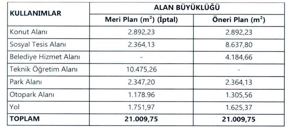 - Konut Alanı Düzenlemesi: Maliye Hazinesi mülkiyetinde olup önceki planda Belediye Hizmet Alanı olan yaklaşık $2.850 \text{ m}^2$‘lik bölüm “Konut Alanı” olarak düzenlenerek hak sahiplerinin sorunu çözüldü.
