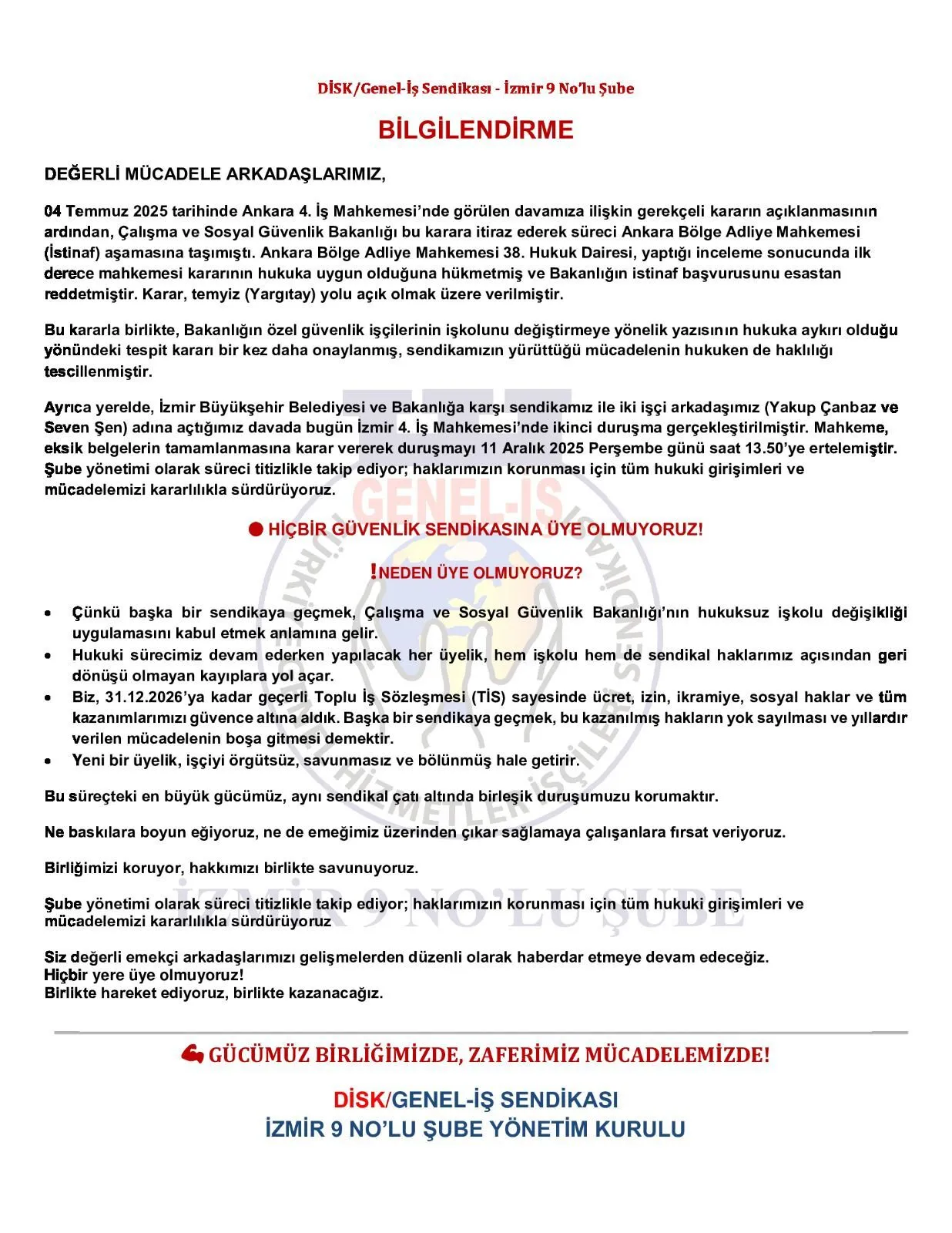 Genel-İş 9 Nolu Şube: “Başka bir sendikaya geçmek, Çalışma ve Sosyal Güvenlik Bakanlığı’nın hukuksuz işkolu değişik uygulamasını kabul etmek anlamına gelir… Hukuki sürecimiz devam ederken yapılacak her üyelik, hem işkolu hem de sendikal haklarımız açısından dönüşü olmayan kayıplara yol açar.”