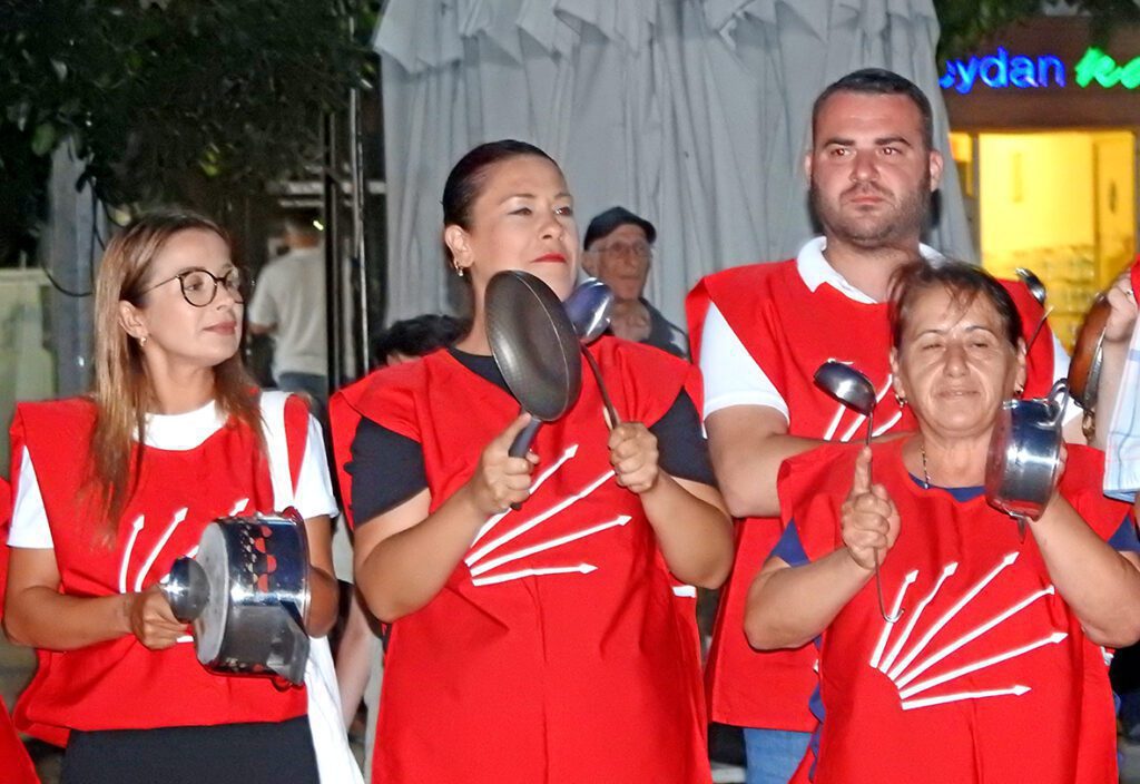 CHP Genel Başkanı Özgür Özel’in geçim sıkıntısı çeken herkesi akşamları saat 21.00’de ışık yakıp söndürmeye çağırmasının ardından CHP Çeşme İlçe Örgütü, Cumhuriyet Meydanı’nda toplanıp, tencere tava çalarak, “Geçinemiyoruz” diye ses yükselttiler.