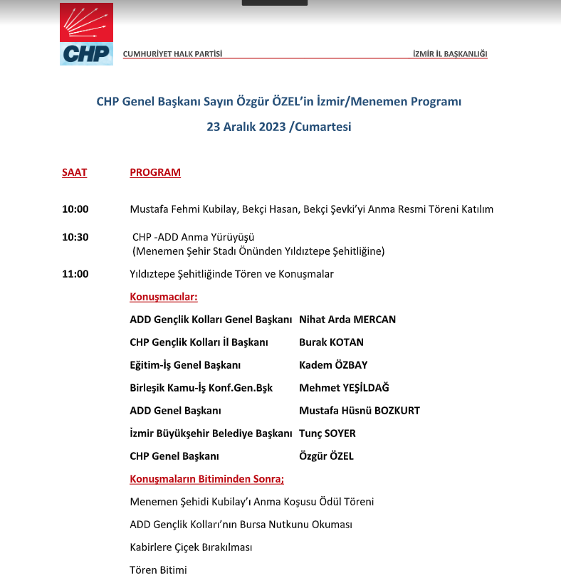 Yürüyüşün ardından Yıldıztepe’de yer alan Kubilay Anıtı’ndaki ikinci tören, çelenk sunumu, saygı duruşunda bulunulması ve istiklal marşının okunmasıyla başlayacak. Programda CHP Genel Başkanı Özgür Özel, İzmir Büyükşehir Belediye Başkanı Tunç Soyer, ADD Gençlik Kolları Genel Başkanı Nihat Arda Mercan, CHP Gençlik Kolları İzmir İl Başkanı Burak Kotan, Eğitim-İş Genel Başkanı Kadem Özbay, Birleşik Kamu-İş Konfederasyonu Genel Başkanı Mehmet Yeşildağ, ADD Genel Başkanı Mustafa Hüsnü Bozkurt konuşma yapacak. Konuşmaların ardından 10 kilometrelik 17’nci Kubilay Yol Koşusu’nda dereceye girenlere ödülleri verilecek.