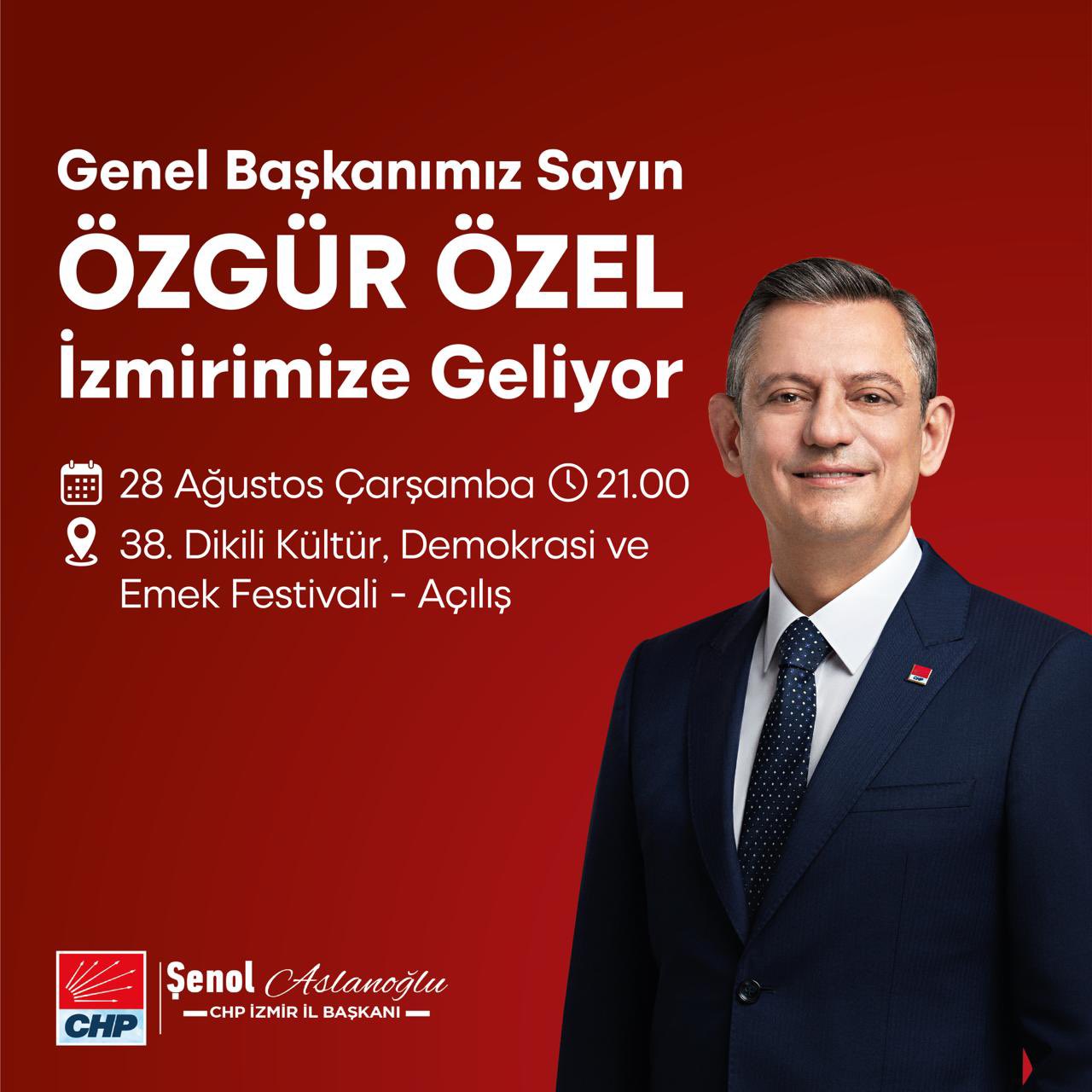 CHP Lideri Özel, Dikili Belediyesi tarafından 28  Ağustos günü 38. Dikili Kültür, Demokrasi ve Emek Festivali’nin açılışına katılacak. Program saat 21.00’de başlayacak.