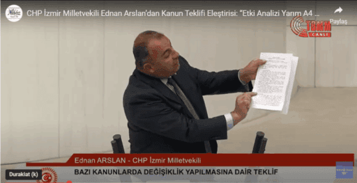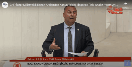 NHABERİZMİR – CHP İzmir Milletvekili Ednan Arslan, TBMM Genel Kurulu’nda kabul edilen Zeytinlik yasasında Değişiklik Yapılmasına Dair Kanun Teklifini eleştirerek, yasanın ciddiyetsiz bir şekilde hazırlandığını ifade etti. Arslan’ın X platformunda paylaştığı videoda, komisyona sunulan etki analizinin yalnızca yarım A4 kağıdından ibaret olduğunu vurgulayarak, “İnsanların yaşamıyla, geleceğiyle, doğayla oynayan bir teklife dair etki analizi yarım A4, muhalefetin yazdığı şerh ise 176 sayfa! Böyle ciddiyetsizlik olmaz!” dedi.
