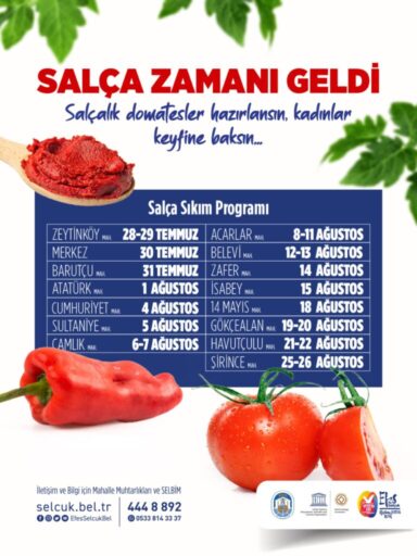 Salça makinası; 28-29 Temmuz’da Zeytinköy’de, 30 Temmuz’da Efes Selçuk Merkez’de, 31 Temmuz’da Barutçu’da, 1 Ağustos’ta Atatürk Mahallesi’nde, 4 Ağustos’ta Cumhuriyet Mahallesi’nde, 5 Ağustos’ta Sultaniye’de, 6-7 Ağustos’ta Çamlık’ta, 8-11 Ağustos’ta Acarlar’da, 12-13 Ağustos’ta Belevi’de, 14 Ağustos’ta Zafer Mahallesi’nde, 15 Ağustos’ta İsabey Mahallesi’nde, 18 Ağustos’ta 14 Mayıs Mahallesi’nde, 19-20 Ağustos’ta Gökçealan’da, 21-22 Ağustos’ta Havutçulu’da, 25-26 Ağustos’ta Şirince’de olacak.
