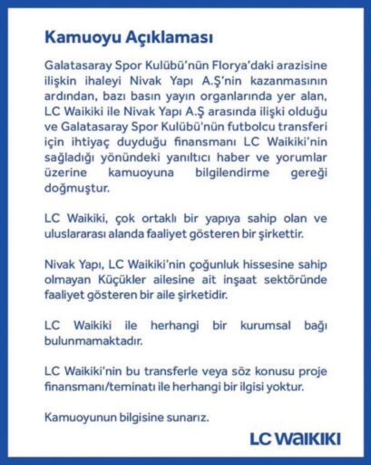 LCW’den gelen resmi açıklamaya göre iddialar asılsız. Ancak küçük bir nüans ile. Nivak yapının Florya arazisine ilişkin ihaleyi kazandığını ve Nivak Yapının LCW de küçük bir ortaklığı olan Küçükler ailesine ait bir şirkettir, firmamızın bağlantısı yok ve LCW galatasaray’ın yaptığı transferler ile hiç bir ilgisinin olmadığı belirtildi.