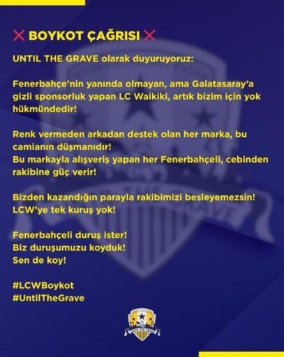 Fenerbahçe taraftarı LCW’ye boykot kararı, , Fenerbahçenin yanında olmayan ancak Galatasay’a gizli sponsor olan LC Waikiki artık bizim için yok hükmündedir. Bizden kazandığın para ile rakibe güç veremezsin!!! “Bu boykot, LCW’nin tutumunu değiştirmesi için bir mesajdır” yorumunda bulundu.