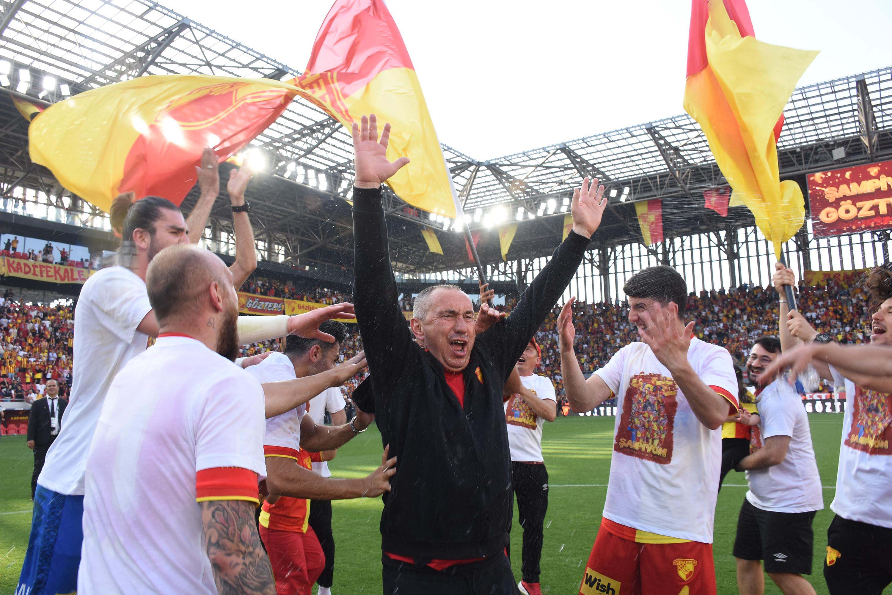 Orta sahaya toplanan oyuncular ve teknik ekip çiftetelli oynadı. “Şampiyon Göztepe” baskılı tişörtleri giyen futbolcular tribünleri tek tek dolaşıp Süper Lig mutluluğunu doyasıya yaşadı.