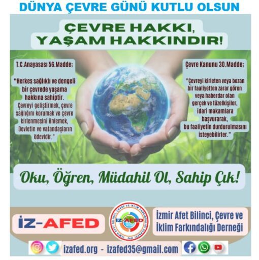 Sağlıklı ve dengeli bir çevrede, afetlere dirençli kentlerde, insanca koşullarda yaşamak umuduyla; tüm İzmir’lilerin yaklaşan 5 Haziran Dünya Çevre Gününü ve ardından gelen kurban bayramını kutluyor, esenlikler diyoruz.