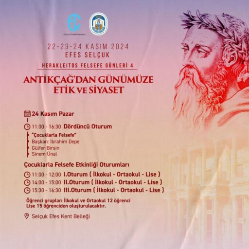 Herakleitos Felsefe Günleri’nin dördüncü buluşması kapsamında düzenlenecek oturumlar kapsamında 24 Kasım Pazar günü 11.00- 16.30 saatleri arasında Selçuk Efes Kent Belleği’nde “Çocuklarla Felsefe” etkinliği düzenlenecek.