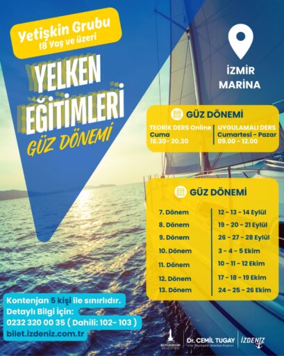Ağustos ayında başlayan ve ekim sonuna kadar devam edecek olan eğitimler, üç günde yelkenin temellerini öğrenmek için ideal bir fırsat. Hafta içi online derslerle bilgilerinizi tazeleyebilir, ardından cumartesi ve pazar günleri doğrudan denizde yelken yaparak öğrendiklerinizi pekiştirebilirsiniz. Kontenjanın 5 kişiyle sınırlı olması, her katılımcının bireysel ilgi görmesini sağlıyor. Maceraya atılmak ve İzmir Körfezi’nin eşsiz manzarasında yelken deneyimi yaşamak isteyenler için kayıtlar online olarak devam ediyor.
