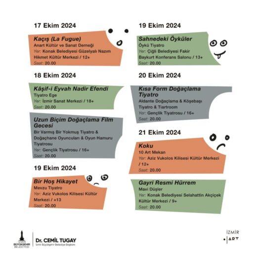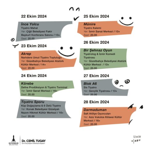 Sahnelenecek tiyatro oyunlarının detaylarına kultursanat.izmir.bel.tr adresinden ulaşılabilir.