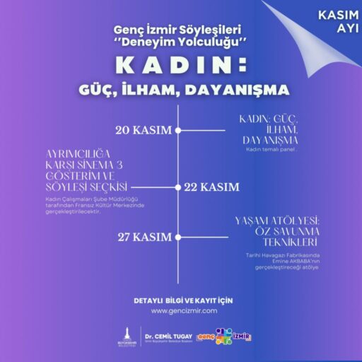Kent genelinde hayata geçirilen projelerle gençlerin fırsat eşitliği gözetilerek sosyal yaşamın temel gereksinimlerinden yoksun kalmaması için çalışan İzmir Büyükşehir Belediyesi ilgi çekici etkinliklere imza atıyor. Bu kapsamda “Genç İzmir Söyleşileri Deneyim Yolculuğu Programı” başlığıyla her ay düzenlenen etkinlikler dizisinin bu ayki teması; “Kadın: Güç, İlham, Dayanışma” olarak belirlendi.