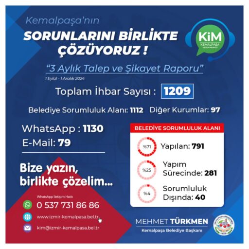 “Bize Yazın, Birlikte Çözelim” sloganıyla vatandaşların taleplerini dikkate alarak çözüm odaklı bir hizmet anlayışı sergileyen Kemalpaşa Belediyesi, WhatsApp, telefon ve e-posta gibi farklı iletişim kanallarıyla vatandaşlardan gelen talepleri değerlendirdiği Kemalpaşa İletişim Merkezi (KİM) raporlarını paylaştı. Kemalpaşa Belediyesi’nin sosyal medya hesaplarından paylaştığı rapora göre, 1 Eylül – 1 Aralık tarihleri arasındaki 3 aylık dönemde belediyenin iletişim kanalları üzerinden alınan 1209 talep ve şikâyetten sorumluluk alanı içerisinde bulunan 1112 ihbardan 791’i çözüme kavuşturuldu.
