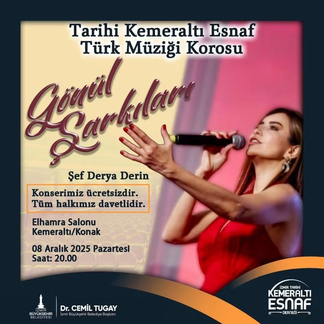 İzmir Tarihi Kemeraltı Esnaf Derneği, esnaflardan oluşan Türk Müziği Korosu ile 5. Büyük Konserini 08 Aralık 2025 Pazartesi günü Konak Elhamra Salonu’nda ücretsiz olarak düzenliyor. Şef Derya Derin yönetimindeki koronun performansı, Kemeraltı’nın kültürel gücünü ve esnaf dayanışmasını sahneye taşıyacak.