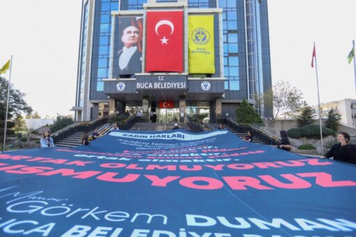 Buca Belediyesi ana hizmet binası önünde ise “Sessizlik, şiddete ortak olmaktır. Görmezden gelmek, şiddete ortak olmaktır. Duymazdan gelmek, şiddete ortak olmaktır. Ortak olmuyoruz. Susmuyoruz” yazılı dev pankart açıldı.