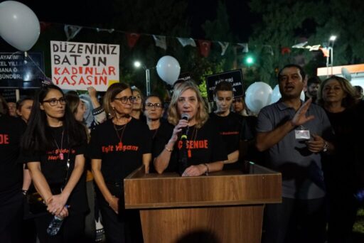 Konuşmasına “Lanetliyorum, lanetliyoruz, kadına kalkan eller kırılsın diyoruz” sözleriyle başlayan