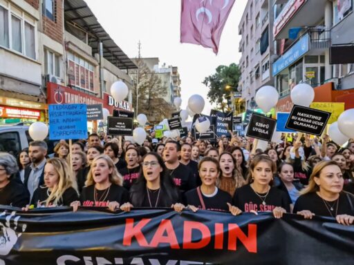 eyleminde ellerinde beyaz balonlar taşıyan kadınlar, ‘Yasta değil isyandayız’, ‘Güç sende’, ‘Kadına