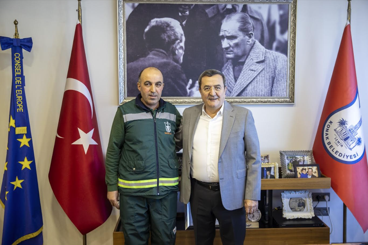 Konak Belediye Başkanı Abdül Batur, görevini yaptığı sırada bulduğu cüzdanı sahibine teslim ederek örnek bir davranış sergileyen temizlik işleri personeli Mehmet Hüseyin Söğüt’e dürüstlüğü ve duyarlılığı için teşekkür etti.