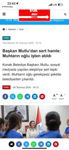 Ulubatlı mahallesi muhtarı Şengül Kahramaner, telefonlarımıza ulaşarak bize farklı bilgiler verdi. Muhtar Şengül hanım Konak Belediye Başkanı Nilüfer Çınarlı Mutlu ile ilgili bir problemi olmadığı, ne zaman bir aramak durumunda olsa başkanın telefonlara çıktığını belirtti bir sorun yok. Çöplerle ilgili de harmandalı çöplüğünün kapanması nedeniyle sadece bizim mahallemiz değil bir çok yer bu sorunu zaman zaman yaşayabiliyor diye konuştu. Oğlunun işten çıkarılması konusunda ise her hangi bir şey konuşmak istemediğini belirtti. dönem dönem her yerde sorunlar olsa da içimizde kısa zamanda çözüyoruz dedi.