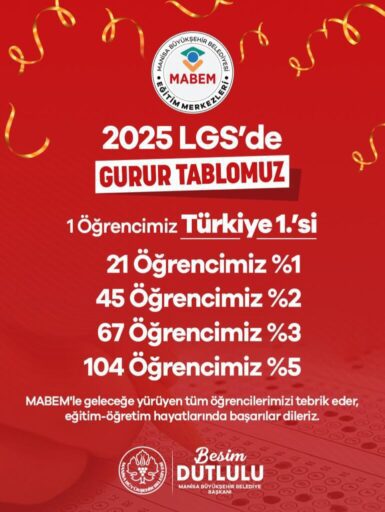 Sunduğu kaliteli eğitim olanaklarıyla 17 ilçede hizmet veren MABEM’lerde sınava hazırlanan bir öğrenci 500 tam puan alarak Türkiye 1.’si olurken, 104 öğrenci ise ilk yüzde 5’lik dilimde yer almayı başardı. Büyükşehir Belediye Başkanı Besim Dutlulu, eğitimde fırsat eşitliğine her zaman öncelik verdiklerini belirterek, her çocuğun kaliteli eğitime ve hayallerine ulaşabilmesi için çalıştıklarını belirterek, öğrencileri ve öğretmenlerini kutladı.