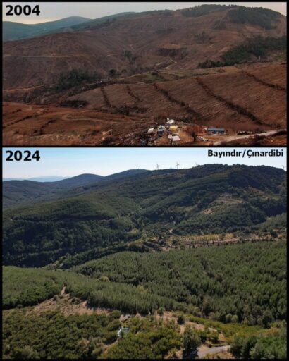 Bu çalışmalara dair somut veriler de paylaştı: Türkiye’de orman varlığı son 13 yılda 1,5 milyon hektar artarken, son 14 yılda ağaç serveti %30 oranında büyüdü. Geçtiğimiz yıllarda İzmir’de yangınlarda kaybedilen alanların ağaçlandırılması ile ilgili de bir sunum paylaşan Yılmaz; “Gördüğünüz gibi yanan alanların hepsi tekrardan ağaçlandırılmış durumda. İmara açılan tek bir m2 alan yok. Fakat biz yangınlarla uğraştığımız kadar bu dezenformasyonlarla da uğraşıyoruz. Halkımız her duyduğuna inanmasın.” çağrısında bulundu.