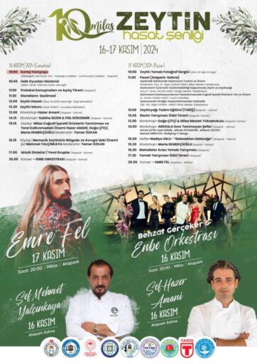 Öncelikle, etkinlik programında Behzat Gerçeker ve ENBE Orkestrası 16 Kasım’da sahne alırken; 17 Kasım’da Emre Fel konser verecek. Ayrıca ünlü şefler Hazer Amani, Mehmet Yalçınkaya, Doğa Çitçi ve Maria Ekmekçioğlu, özel workshop ve söyleşilerde katılımcılarla buluşacak. Bu sayede Milas’ın coğrafi işaretli zeytin ve zeytinyağı ürünlerinin tanıtımı da yapılacak.