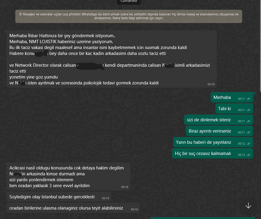 Anlam veremediğimiz konuların başında NMT Lojistik firması üst yönetimi hakkında olumusuz hiç bir duyum olmamasına rağmen, bunca farklı genç insandan gelen ihbarlara, yaşanan olaylar iddialarına karşın, hiç bir işlem yapmadan, bu kişilerin firma çatısı altında çalıştırmaya devam edip, hiç bir şey yokmuş gibi davranmaları akıllara çeşitli sorular getiriyor.