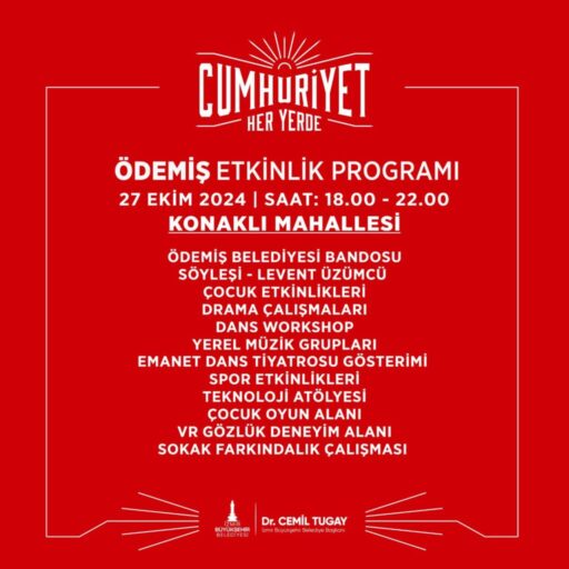 29 Ekim Cumhuriyetimizin 101. yılı tüm yurtta olduğu gibi Ödemiş’te de organize edilen etkinliklerle kutlanacak. 27 Ekim Pazar günü İzmir Büyükşehir Belediyesi’nin “Cumhuriyet Her Yerde” sloganıyla yapılacak ilk etkinlik Konaklı Mahallesi’nde 18:00-20:00 saatleri arasında gerçekleşecek. Çocuklara yönelik oyun grupları ve aktivitelerin yer aldığı program da Levent Üzümcü ile söyleşi düzenlenecek.