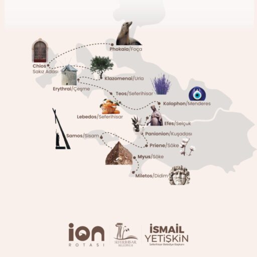 Ephesos (Efes), Teos (Seferihisar), Kolophon (Menderes), Klazomenai (Urla), Phokaia (Foça), Lebedos (Seferihisar), Priene (Söke), Miletos (Milet), Myus (Söke), Didyma (Didim) ve Chios (Sakız Adası), Samos ve Paninion (Kuşadası) şehirlerinden oluşan İon Rotası, Ege’nin en önemli antik yerleşimlerinden olan İonia şehirlerinin geçmişini bugünün değerleriyle buluşturuyor. Seferihisar Belediyesi’nin öncülüğünde, tarihi ve kültürel turizmi geliştirme amacıyla hazırlanan proje, bölgedeki arkeolojik alanlara dikkat çekerek yerel ve uluslararası turistlerin ilgisini çekiyor.