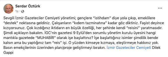 Öztürk, “Sevgili İzmir Gazeteciler Cemiyeti yönetimi; gençlere “istihdam” diye yola çıkıp, emeklilere “destek” noktasına geldiniz. Çalışanların “kıdem tazminatına” kadar göz diktiniz. Faşist deyince kızıyorsunuz. Çok kızdığınız iktidarın en büyük özelliği, her şehirde kendi “reisini” yaratmasıdır. Şimdi açıklayın bakalım. İGC’nin gazetesi 9 Eylül’den sorumlu yönetim kurulu üyesini hangi mantıkla gazetede “MUHABİR” olarak işe başlattınız? İşe başlattığınız isimler şimdilik bende kalsın ama bu yaptığınız tam “reis” işi. O yüzden kimseye kızmaya, eleştirmeye hakkınız yok. Basın emekçilerinin üzerinden plan/proje geliştirmeyi bırakın.” dedi.