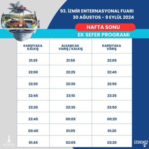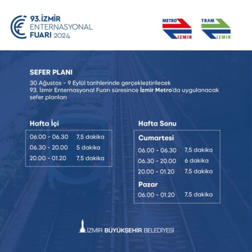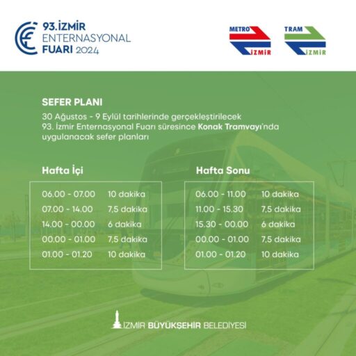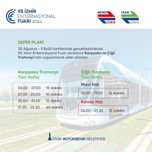 İzmir Büyükşehir Belediyesi, Kültürpark’ta 30 Ağustos-9 Eylül tarihleri arasında düzenlenecek 93’üncü İzmir Enternasyonal Fuarı için toplu ulaşımda sefer sıklığını artıracak. Tüm ulaşım modlarında son sefer saatleri de uzatılacak.