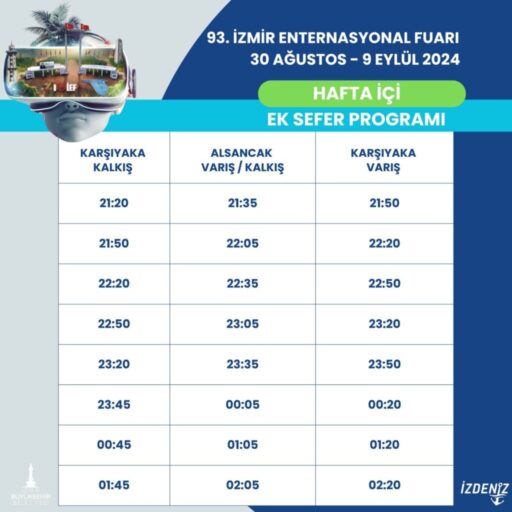 Deniz ulaşımında da fuar süresince ulaşımı kolaylaştıracak önlemler alındı. 30 Ağustos – 9 Eylül tarihleri arasında Karşıyaka-Alsancak-Karşıyaka hattında, hafta içi saat 21.20, hafta sonu ise 21.35’ten itibaren 8 ek sefer yapılacak. Alsancak’tan son gemi 02.05’te kalkacak. Ayrıntılı sefer tarifesine www.izdeniz.com.tr adresinden ulaşılabilir.