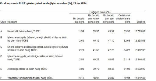 İşlenmemiş gıda ürünleri, enerji, alkollü içkiler ve tütün ile altın hariç TÜFE’deki değişim, 2024 yılı Ekim ayında bir önceki aya göre yüzde 2,69, bir önceki yılın Aralık ayına göre yüzde 40,12, bir önceki yılın aynı ayına göre yüzde 47,10 ve on iki aylık ortalamalara göre yüzde 62,65 olarak gerçekleşti.