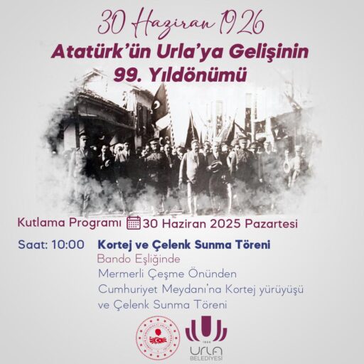 Gazi Mustafa Kemal Atatürk’ün 30 Haziran 1926 tarihinde Urla’ya gerçekleştirdiği ziyaretin 99. yıl dönümü, Urla’da düzenlenecek tören ve etkinliklerle kutlanacak. Urla Belediyesi, bu özel günü Atatürk’e duyulan sevgi, saygı ve minnetle anmak için kapsamlı bir program hazırladı. Kutlamalar, 30 Haziran 2025 Pazartesi günü saat 10.00’da başlayacak. Mermerli Çeşme önünden bando eşliğinde kortej yürüyüşü ile başlayacak tören, Cumhuriyet Meydanı’ndaki çelenk sunma programı ile devam edecek.
