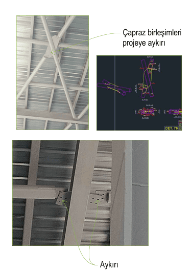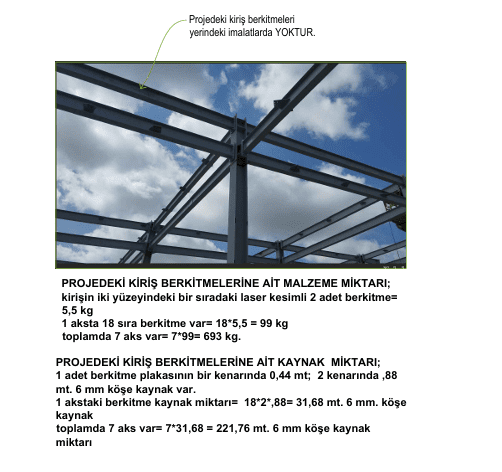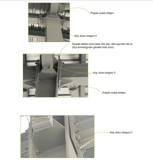 Montajla ilgili Bazı Tereddütler: Kolon ek yapılma şekli, kaynak bağlantıları ve cıvatalı birleşimlerde teknik gerekliliklerin tam olarak karşılanmadığı düşünülmektedir. Ayrıca, kolon- zemin bağlantıları konusunda da bazı teknik sıkıntılar yaşanmış olabileceği değerlendirilmektedir.